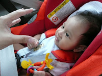 Anyway, among the things that I packed for the trip was a bag full of Asher's toys to amuse him on the car rides to and from Malacca. His colourful 'book' that he's had since he was born, a new teether JJSB gave Asher, an improvised car seat toy (I had seen in stores how some toys had clips which looked like clothes pegs that were used to attach the toy to the bar of the car seat, so I decided to just use clothes pegs, and some hook/rings from another toy of Asher's to make a car toy!), his toy that my Mum gave him, etc. Actually my hand came in handy for many entertaining rounds of Twinkle, Twinkle, Little Star too :)