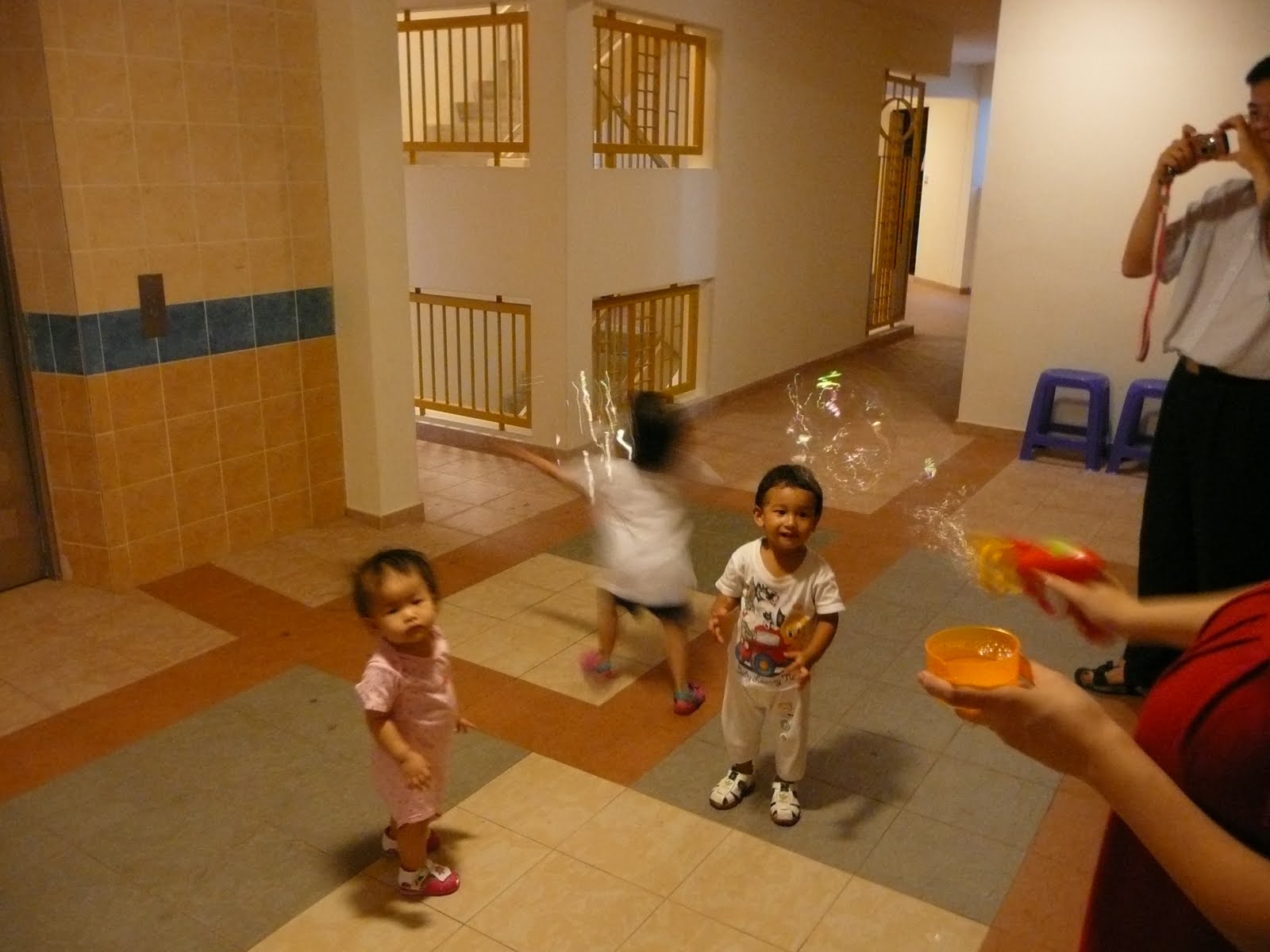 The great thing about having neighbours with kids about the same age as yours...a natural playgroup! We've lately started to have bubble playing sessions in the lift lobby. It's great! We can blow as many bubbles as we please without worrying about having to clean the house! :) And more kids mean more excitement when playing with bubbles :) So, hooray for HDB living!